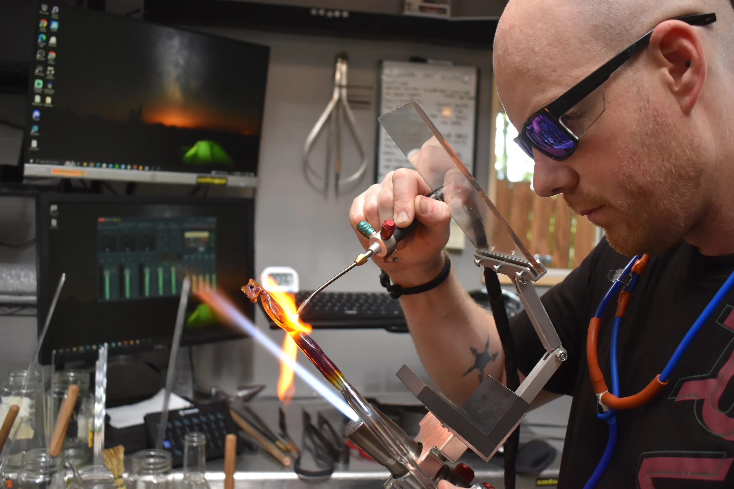 On Aug 3rd 2022, after many years of cobbling together what I could to set up a home studio, and finally having a functional space to set up shop, I had a freak incident with an electrical issue not related to my glass equipment and my studio went up in flames. After some argues work and lots of help from family and friends, I have a proper working glass studio again. I could still use a lot of help to really get things off the ground. If your able and would like to help, my family and I would be grateful.